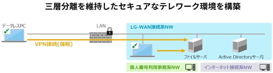 ほかにも、テレワークを行う際にデータレスPCを使ってLGWAN環境と接続することで、遠隔でもファイル操作が容易になり、セキュリティと利便性を両立可能にしたという事例もある。